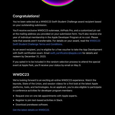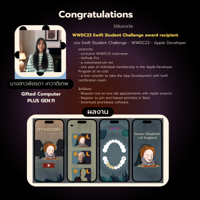 ขอแสดงความยินดีกับ นางสาวพัชรดา เทวาดิเทพ ม.6/7 นักเรียนในโปรแกรมส่งเสริมอัจฉริยภาพผู้เรียนด้านเทคโนโลยี (Gifted Computer GEN.11) ที่เป็น 1 ใน 7 คนของประเทศไทยได้รับรางวัล “WWDC23 Swift Student Challenge award recipient” ภายใต้งาน Swift Student Challenge – WDC23 – Apple Developer ระดับนานาชาติ แข่งขันรูปแบบออนไลน์ จัดการแข่งขันโดย บริษัท Apple ซึ่งจะได้รับของรางวัล และสิทธิพิเศษมากมาย ดังนี้