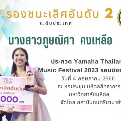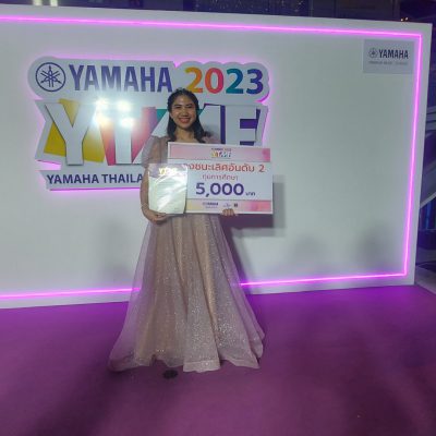 – รางวัลรองชนะเลิศ อันดับ 2 รายการแข่งขัน Yamaha Thailand Music Festival 2023 รอบชิงชนะเลิศชิงถ้วยประทาน ประเภท Singing with backing track รุ่นอายุไม่เกิน 15 ปี รับรับใบประกาศนียบัตร พร้อมโล่รางวัล และเงินทุนการศึกษา 5,000 บาท เมื่อวันที่ 4 พฤษภาคม 2566 ณ หอประชุม มหิดลสิทธาคาร มหาวิทยาลัยมหิดล ศาลายา จัดการแข่งขันโดย สถาบันดนตรียามาฮ่า
