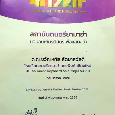 ขอแสดงความยินดีกับ เด็กหญิงขวัญหทัย สัตยาสวัสดิ์(ขวัญ) ชั้น ป.2/1 ได้รับรางวัล ดีเด่น ประเภท Junior Keyboard Solo อายุไม่เกิน 7 ปี รายการ Yamaha Music Festival 2023 จัดแข่งโดย สถาบันดนตรี ยามาฮ่า ณ มหิดลสิทธาคาร วิทยาลัยดุริยางคศิลป์ มหาวิทยาลัยมหิดล แข่งขันวันที่ 2 พฤษภาคม พ.ศ.2566 ระดับประเทศ