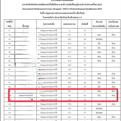 จากการแข่งขันอัจฉริยภาพคณิศาสตร์โอลิมปิกนานาชาติ(รอบคัดเลือกภูมิภาคประจําประเทศไทย2023) International Mathematical Genius Olympiad – IMGO (Thailand Regional Qualification 2023) จัดโดย มูลนิธิโครงการสอบวัดทักษะวิชาการ (สวช.)และโอลิมปิกนานาชาติ เมื่อวันที่ 6 พฤษภาคม 2566