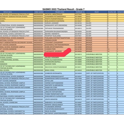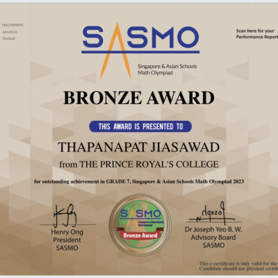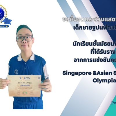 ขอชื่นชมและร่วมแสดงความยินดีกับ เด็กชายฐปนพัฒน์ เจียสวัสดิ์ นักเรียนชั้นมัธยมศึกษาปีที่ 2 ที่ได้รับรางวัลเหรียญทองแดง จากการแข่งขันรายการคณิตศาสตร์นานาชาติ SASMO(Singapore &Asian Schools Math Olympiad) และ มีสิทธิ์สอบรอบต่อไปSingapore math global final ที่ประเทศสิงคโปร์ โดยสอบออนไลน์วันที่ 8เมษายน 2566 จัดโดย American Math Olympiad Thailand