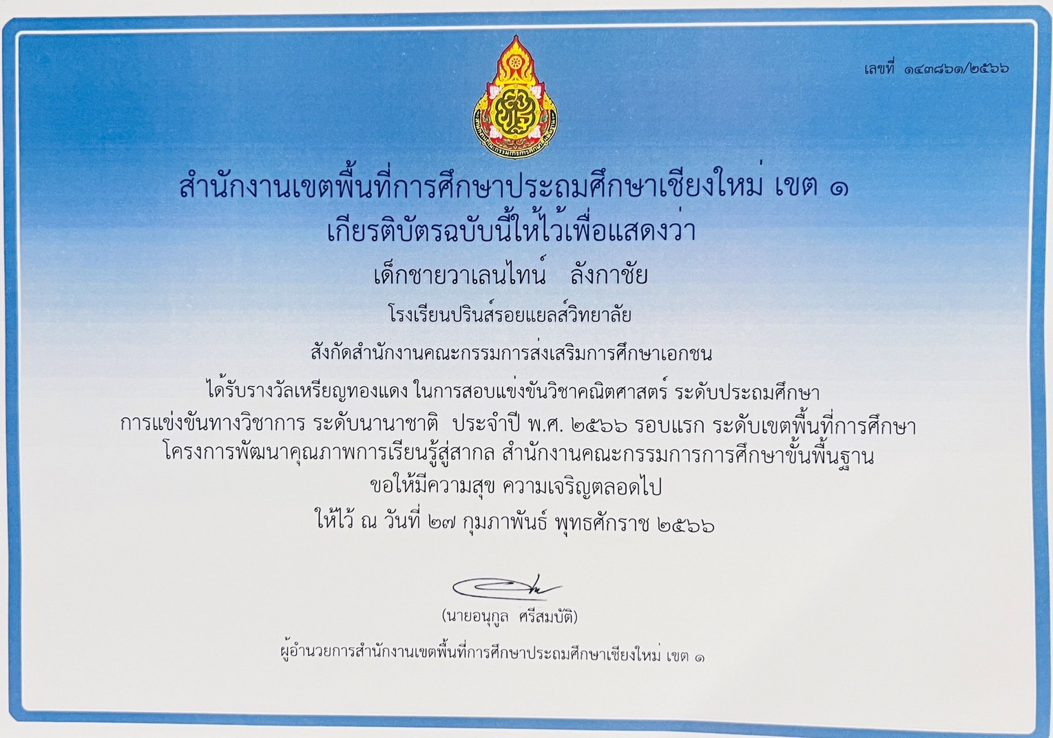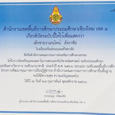 จากการแข่งขันวิชาการ (สพฐ) ระดับนานาชาติ ประจำปี พ.ศ.2566 รอบแรก จัดโดย สำนักงานเขตพื้นที่การศึกษาประถมศึกษาเชียงใหม่เขต 1 เมื่อวันที่ 27 กุมภาพันธ์ 2566