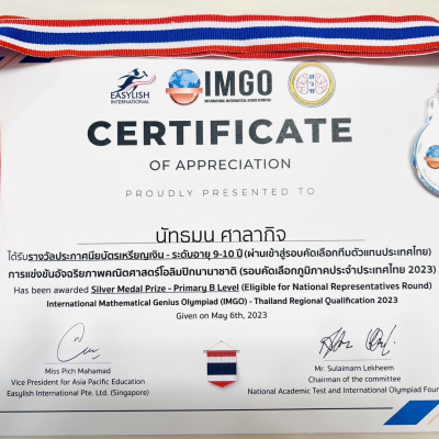 ในการแข่งขันอัจฉริยภาพคณิตศาสตร์โอลิมปิกนานาชาติ จัดโดย มูลนิธิโครงการวัดทักษะวิชาการ (สวช.) และโอลิมปิกนานาชาติ
