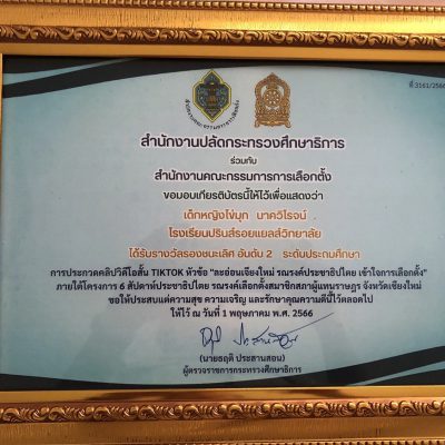 เด็กหญิงไข่มุก นาควิโรจน์ ชั้นประถมศึกษาปีที่ 3 / 6ได้รับรางวัลรองชนะเลิศอันดับ 2 ระดับประถมศึกษา จากการประกวดคลิปวีดีโอสั้น TIKTOK หัวข้อ “ละอ่อนเจียงใหม่ รณรงค์ประชาธิปไตย เข้าใจการเลือกตั้ง” ภายใต้โครงการสัปดาห์ประชาธิปไตย รณรงค์เลือกตั้งสมาชิกสภาผู้แทนราษฎร์ จังหวัดเชียงใหม่ จัดโดยสำนักงานศึกษาธิการจังหวัดเชียงใหม่ร่วมกับสำนักงานคณะกรรมการการเลือกตั้ง ณ สำนักงานศึกษาธิการจังหวัดเชียงใหม่ เมื่อวันที่ 14 พฤษภาคม 2566