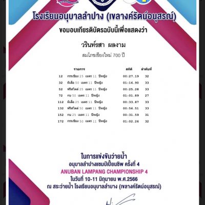 จากการแข่งขันว่ายน้ำ รร.อนุบาลลำปางแชมป์เปี้ยนชิพ ระหว่างวันที่ 11-12 มิถุนายน 2556