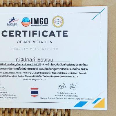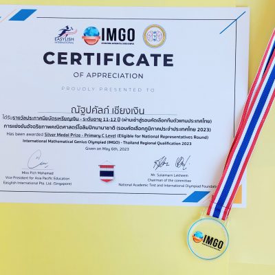 - รางวัลประกาศนียบัตรเหรียญเงิน ระดับอายุ 11 – 12 ปีการแข่งขันอัจฉริยะภาพคณิตศาสตร์โอลิมปิกนานาชาติ(รอบคัดเลือกภูมิภาคประจำประเทศไทย 2023) (ผ่านการเข้าสู่รอบคัดเลือกตัวแทนประเทศไทย) สำนักงานโครงการสอบวัดทักษะวิชาการระดับชาติ สวช เมื่อวันที่ 6 พฤษภาคม 2566