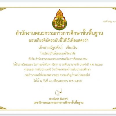 - รางวัลชมเชย ในการแข่งขันทางวิชาการระดับนานาชาติประจำปีพ.ศ. 2566 (รอบสองระดับประเทศ ) วิชาวิทยาศาสตร์ จัดโดยสำนักงานคณะกรรมการการศึกษาขั้นพื้นฐาน เมื่อวันที่ 30 เมษายน 2566