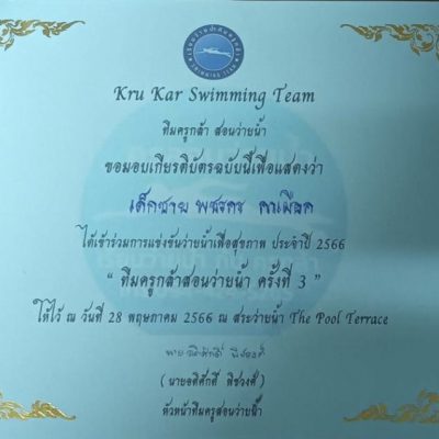 ขอชื่นชมและร่วมแสดงความยินดีกับ เด็กชายพชรกร กาเผือก ชั้น ประถมศึกษาปีที่ 2/10 ที่ได้รับรางวัล 1 เหรียญทอง 1 เหรียญเงิน และ 1 เหรียญทองแดง จากการแข่งขันรายการ การแข่งขันว่ายน้ำเพื่อสุขภาพ ประจำปี 2566 ณ The Pool Terrace เมื่อวันที่ 28 พฤษภาคม 2566