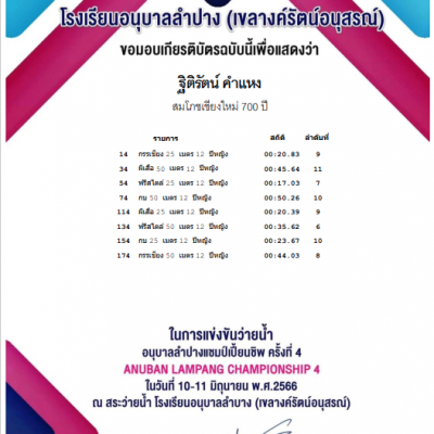 จากการแข่งขันว่ายน้ำ อนุบาลลำปางแชมเปี้ยนชิพ ประจำปี 2566 ณ สระว่ายน้ำโรงเรียนอนุบาลลำปาง จ.ลำปาง จัดโดย โรงเรียนอนุบาลลำปาง จ.ลำปาง เมื่อวันที่ 10 – 11 มิถุนายน  2566