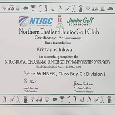 จากการแข่งขัน NTJGC-ROYAL CHIANGMAI JUNIOR GOLF CHAMPIONSHIPS 2022-2024 จัดโดย ชมรมนักกอล์ฟเยาวชนไทย ภาคเหนือ เมื่อวันที่ 10 – 11 มิถุนายน 2566