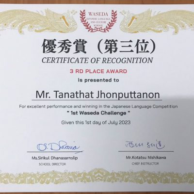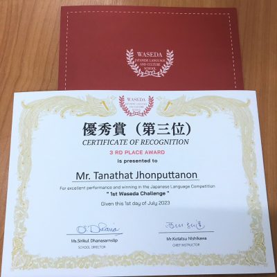 ขอชื่นชม และแสดงความยินดีกับ นายธนทัต จรพุทธานนท์ นักเรียนชั้น ม.4/9 ที่ได้รับรางวัลชนะเลิศอันดับ 3 “ การสะกดคำภาษาญี่ปุ่น N5″ ระดับมัธยมศึกษาตอนปลายหรือเทียบเท่า จากการแข่งขัน 1st Waseda Challenge การแข่งขันทักษะภาษาญี่ปุ่น ครั้งที่ 1 เมื่อวันที่ 16 มิถุนายน พ.ศ. 2566 ณ โรงเรียนสอนภาษาและวัฒนธรรมญี่ปุ่นวาเซดะ เชียงใหม่ (ระดับภาค)