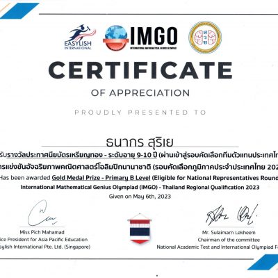 ที่ได้รับรางวัลประกาศนียบัตรเหรียญทอง ระดับอายุ 9 – 10 ปี จาก การแข่งขันอัจฉริยภาพคณิตศาสตร์โอลิมปิกนานาชาติ (รอบคัดเลือกภูมิภาคประจำประเทศไทย 2023)