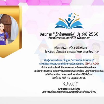 จากโครงการ “เด็กไทยคนเก่ง” ประจำปี 2566 จัดโดยองค์การส่งเสริมเยาวชนสร้างสรรค์พัฒนาสังคม (เครือข่ายวัฒนธรรม ระดับสภาวัฒนธรรมแห่งประเทศไทย ประเภทองค์กรเอกชน