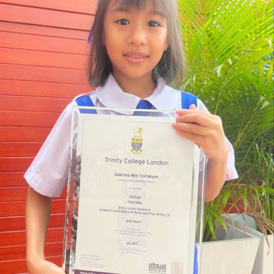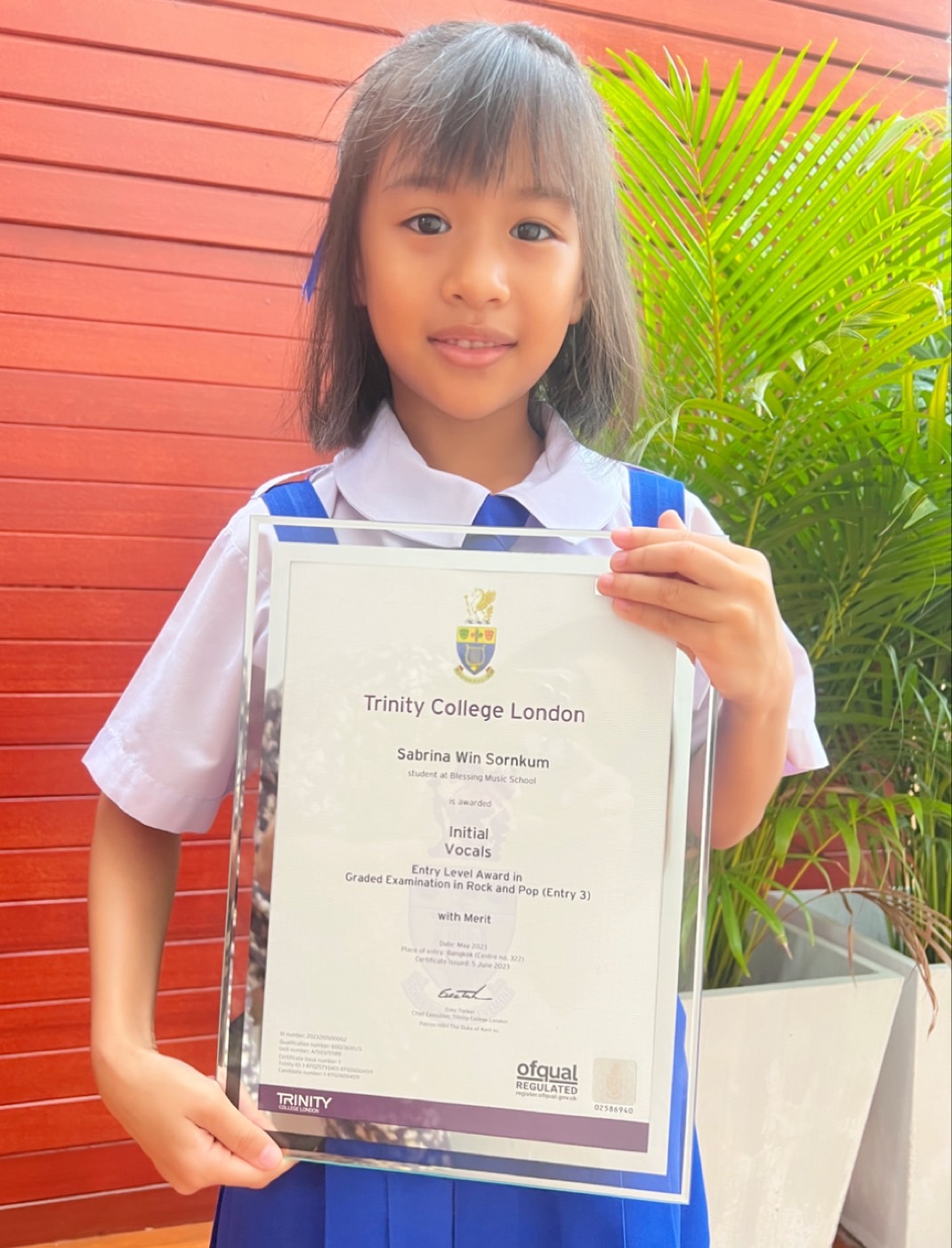 ขอชื่นชมและร่วมแสดงความยินดีกับ เด็กหญิงซาบริน่า วินน์ สอนคำ ชั้นประถมศึกษาปีที่ 2/1 สอบ ที่ได้รับรางวัลเกียรตินิยม อันดับ 2Initial Vocal จากสถาบัน Trinity College of London