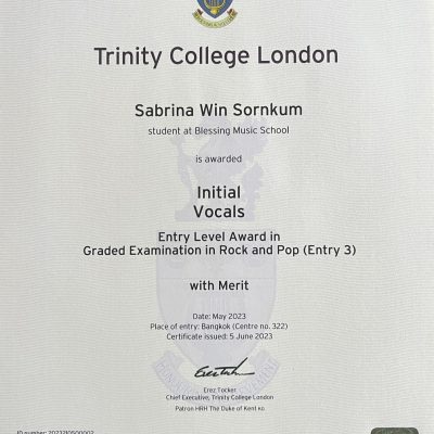 เด็กหญิงซาบริน่า วินน์ สอนคำ ชั้นประถมศึกษาปีที่ 2/1 สอบ Initial Vocal จากสถาบัน Trinity College of London