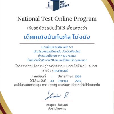 เด็กหญิงนันท์นภัส โด่งดัง ชั้นประถมศึกษาปีที่ 3/3 ได้รับรางวัล เหรียญทองแดง วิชา คณิตศาสตร์ จากรายการ สอบวัดระดับความรู้ทางวิชาการแบบออนไลน์ระดับประเทศ เมื่อวันที่ 7-21 มิถุนายน 2566 จัดโดยหน่วยงาน National Test Online Program(ระดับประเทศ)