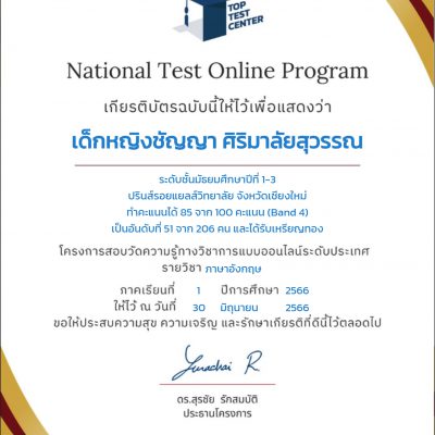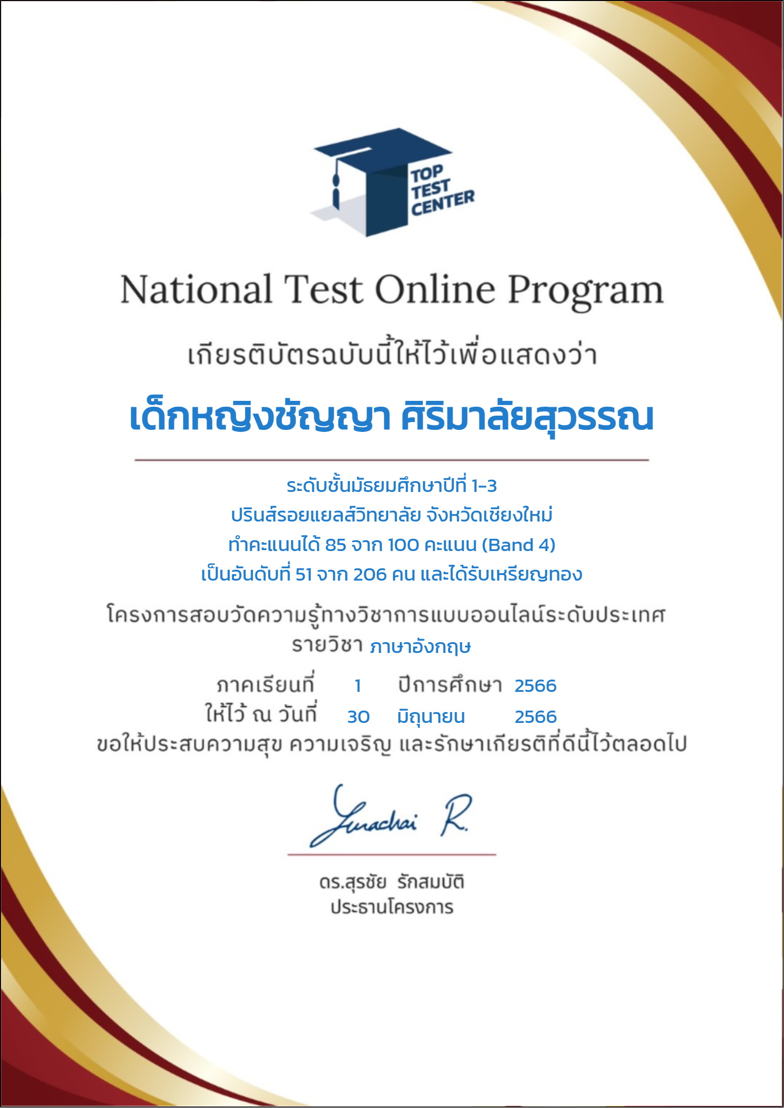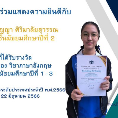 ขอชื่นชมและร่วมแสดงความยินดีกับ เด็กหญิงชัญญา ศิริมาลัยสุวรรณ นักเรียนชั้นมัธยมศึกษาปีที่ 2 ที่ได้รับรางวัล เหรียญทอง วิชาภาษาอังกฤษ ระดับชั้นมัธยมศึกษาปีที่1-3 (Silver Medal) จากการแข่งขันรายการทางวิชาการระดับประเทศประจำปี พ.ศ.2566 จัดโดย Top Test Center เมื่อวันที่ 22 มิถุนายน 2566