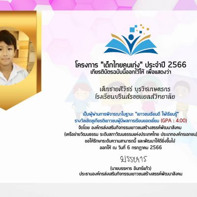 ที่ได้รับรางวัลผู้ผ่านการพิจารณาในฐานะ “เยาวชนเรียนดี ใฝ่เรียนรู้” รางวัลเชิดชูเกียรติเยาวชนผู้มีผลการเรียนยอดเยี่ยม (GPA:4.00)