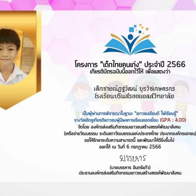 ขอชื่นชมและร่วมแสดงความยินดีกับเด็กชายณัฏฐวัฒน์ บุรวิชเกษตรกร ที่ได้รับเกียรติบัตรโครงการ “เด็กไทยคนเก่ง” จากองค์กรส่งเสริมกิจกรรมเยาวชนสร้างสรรค์พัฒนาสังคมในฐานะ “เยาวชนเรียนดี ใฝ่เรียนรู้” รางวัลเชิดชูเกียรติเยาวชนผู้มีผลการเรียนยอดเยี่ยม GPA : 4.00 จัดโดยองค์กรส่งเสริมกิจกรรมเยาวชนสร้างสรรค์พัฒนาสังคม ณ วันที่ 6 กรกฏาคม 2566