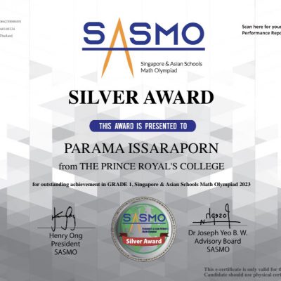 1.Silver Award ในรายการแข่งขันคณิตศาสตร์โอลิมปิก นานาชาติ SASMO 2023 (Singapore & Asian School Math Olympiad) Global Rank 57