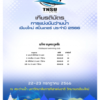 วันที่ 22-23 กรกฎาคม 2566 ณ สระว่ายน้ำมหาวิทยาลัยการกีฬาแห่งชาติ วิทยาเขตเชียงใหม่ จังหวัดเชียงใหม่