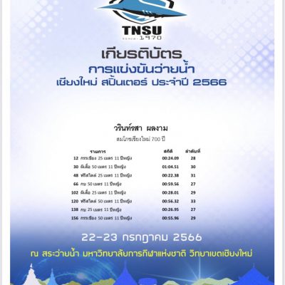 ที่ได้รับรางวัลรางวัลในรายการดังต่อไปนี้จากการแข่งขันว่ายนำ้เชียงใหม่สปริ้นเตอร์ ประจำปี 2566