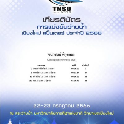 รายการแข่งขันว่ายน้ำเชียงใหม่ สปิ้นเตอร์ ประจำปี 2566 ณ สระว่ายน้ำมหาวิทยาลัยการกีฬาแห่งชาติ วิทยาเขตเชียงใหม่