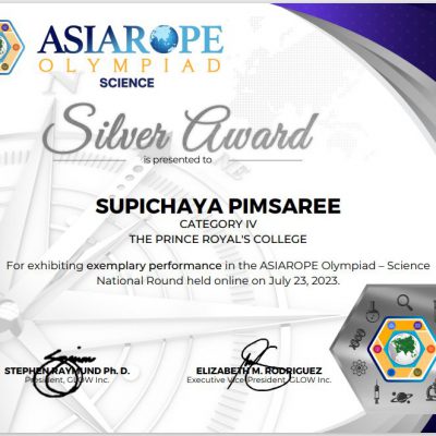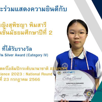 ขอชื่นชมและร่วมแสดงความยินดีกับเด็กหญิงสุพิชญา พิมสารี นักเรียนชั้นมัธยมศึกษาปีที่ 2 ที่ได้รับรางวัลเหรียญเงิน Silver Award (Category IV) จากการแข่งขันวิทยาศาสตร์โอลิมปิกระดับนานาชาติ ASIAROPE Olympiad Science 2023 : National Round จัดโดย META Knowledge เมื่อวันที่ 23 กรกฎาคม 2566