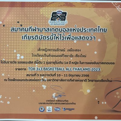 ขอชื่นชมและร่วมแสดงความยินดีกับเด็กหญิงพรรณลักษณ์ เหมืองสอง นักเรียนชั้นมัธยมศึกษาปีที่ 1 ที่ได้รับรางวัลรองชนะเลิศ อันดับ 1 รุ่นอายุไม่เกิน 14 ปี หญิง จากการแข่งขันบาสเกตบอลรายการ TOA 3*3 BASKETBALL ALL THAILAND 2023 สนาม 5 จัดโดย สมาคมกีฬาบาสเกตบอลแห่งประเทศไทย ระหว่างวันที่ 10 – 11 มิถุนายน 2566 ณ มหาวิทยาลัยการกีฬาแห่งชาติ วิทยาเขตเชียงใหม่