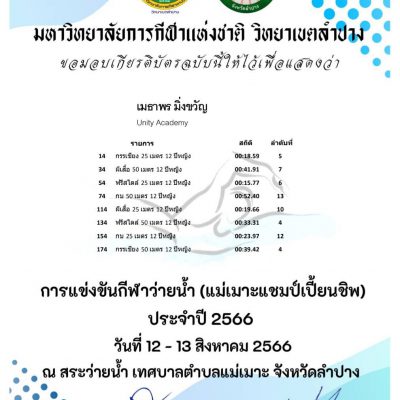 จากการแข่งขันว่ายน้ำ รายการแม่เมาะแชมป์เปี้ยนชิพ ประจำปี 2566 จัดโดยมหาวิทยาลัยการกีฬา วิทยาเขตลำปาง ณ สระว่ายน้ำ เทศบาลตำบลแม่เมาะ จังหวัดลำปาง ระหว่างวันที่ 12 – 13 สิงหาคม 2566