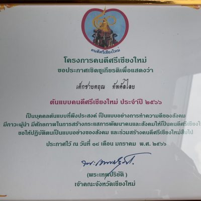 จากโครงการคนดีศรีเชียงใหม่ โดยพระเทพปริยัติ เจ้าคณะจังหวัดเชียงใหม่ เมื่อวันที่ 18 มกราคม 2566
