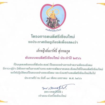 จากรายการ บุคคลต้นแบบที่พึงประสงค์ เป็นแบบอย่างการทำความดีของสังคม มีภาวะผู้นํา มีศักยภาพในการสร้างกระแสการพัฒนาคนและสังคมให้เป็นคนดีศรีเชียงใหม่ จัดโดย โครงการคนดีศรีเชียงใหม่ เมื่อวันที่ 18 มกราคม พ.ศ. 2566