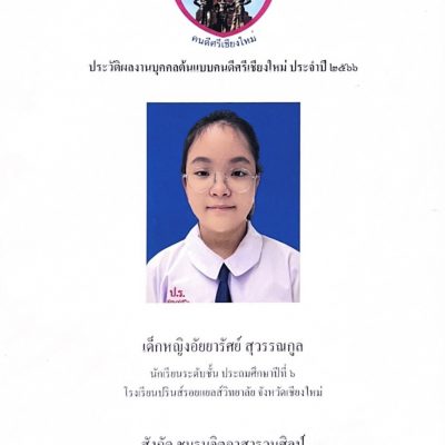ขอชื่นชมและแสดงความยินดีกับ เด็กหญิงอัยยารัศย์ สุวรรณกูล นักเรียนชั้นประถมศึกษาปีที่ 6