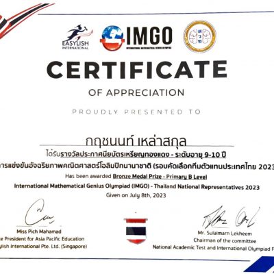 จากการแข่งขันอัจฉริยภาพคณิตศาสตร์โอลิมปิกนานาชาติ (รอบคัดเลือกทีมตัวแทนประเทศไทย 2023) International Mathematical Genius Olympiad – IMGO (World Championship 2023) จัดโดย มูลนิธิโครงการสอบวัดทักษะวิชาการและโอลิมปิกนานาชาติ (มูลนิธิ สวช. และโอลิมปิกนานาชาติ) เมื่อวันที่ 8 กรกฎาคม 2566