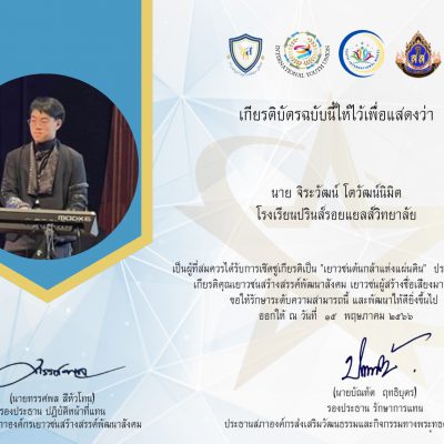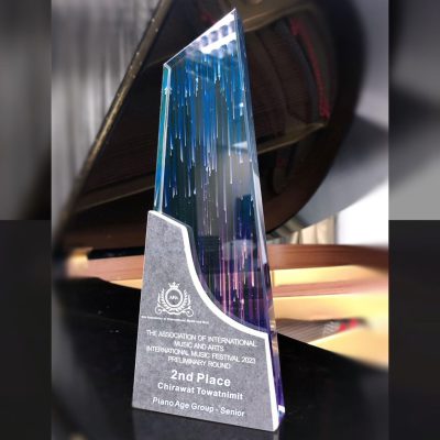 - รางวัลที่ 2 การแข่งขันเปียโนนานาชาติ AIMA Festival 2023 (Preliminary Round) Video Submission รุ่น Age Group Senior เมื่อวันที่ 31 มีนาคม 2566 จัดโดย The Association of International Music & Arts – AIMA ประเทศไต้หวัน Taiwan