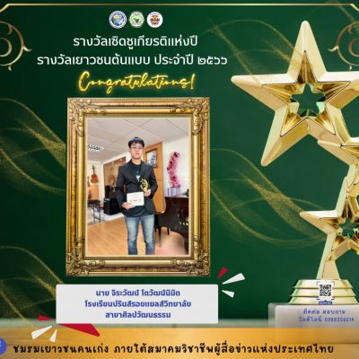 - รางวัลเยาวชนต้นแบบ ประจำปี 2566 สาขาศิลปวัฒนธรรม ภายใต้โครงการ “ต้นกล้าจิตอาสา เอื้อเฟื้อเผื่อแผ่ ร่วมใจพัฒนา รักษาความดี สร้างสรรค์สังคม” เมื่อวันที่ 15 พฤษภาคม 2566 จัดโดยชมรมเยาวชนคนเก่ง ภายใต้สมาคมวิชาชีพผู้สื่อข่าวแห่งประเทศไทย