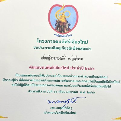 ที่ได้รับใบประกาศนียบัตรเชิดชูเกียรติ ต้นแบบคนดีศรีเชียงใหม่ ประจำปี 2566 สังกัด Jeju Taekwondo Chiangmai Thailand จาก พระเทพปริยัติ เจ้าคณะจังหวัดเชียงใหม่