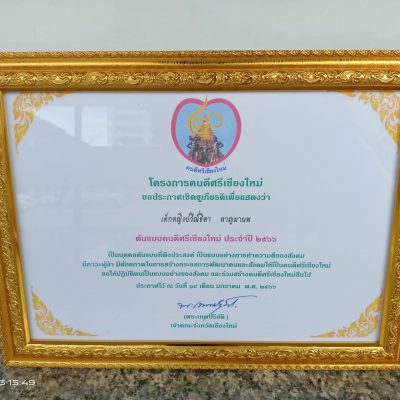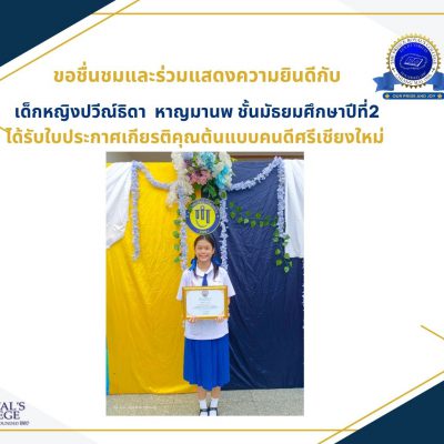 ขอชื่นชมและร่วมแสดงความยินดีกับ เด็กหญิงปวีณ์ธิดา หาญมานพ นักเรียนชั้นมัธยมศึกษาปีที่ 2 ที่ได้รับใบประกาศเกียรติคุณต้นแบบคนดีศรีเชียงใหม่ ครบรอบ 20 ปีพุทธศักราช 2566 ครั้งที่ 2 ณ หอประชุมมหาวิทยาลัยฟาร์อิสเทอร์น อำเภอเมือง จังหวัดเชียงใหม่ ในวันเสาร์ที่ 19 สิงหาคม 2566 เวลา 09:00 น. ถึง 15.30 น. เครือข่ายสภาวัฒนธรรม อำเภอเมืองเชียงใหม่ โดยมีพระเทพสิงหวราจารย์ รองเจ้าคณะจังหวัดเชียงใหม่ เจ้าอาวาสวัดพระสิงห์วรมหาวิหารเป็นประธานในพิธี และเป็นผู้มอบใบประกาศเกียรติคุณต้นแบบคนดีศรีแผ่นดิน และคนดีศรีเชียงใหม่