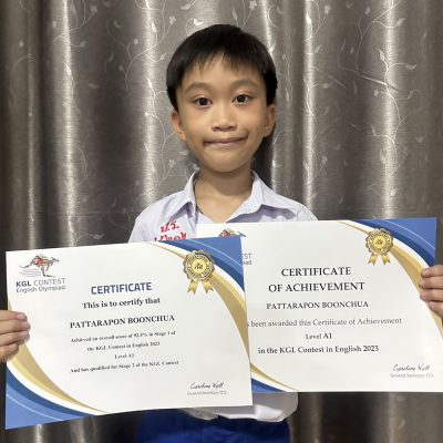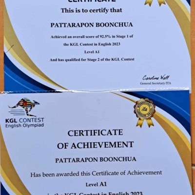 KGL Contest English Olympiad 2023 : State 1 ครั้งที่ 9 ระดับ Level : A1 ผลคะแนน ร้อยละ 92.5 ผ่านเข้า stage 2