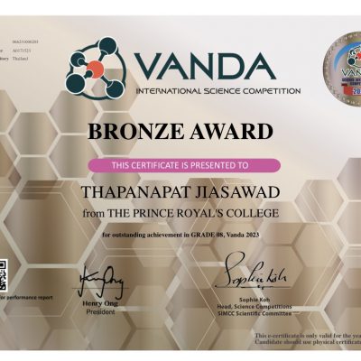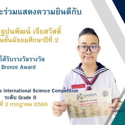 ขอชื่นชมและร่วมแสดงความยินดีกับ เด็กชายฐปนพัฒน์ เจียสวัสดิ์ นักเรียนชั้นมัธยมศึกษาปีที่ 2 ที่ได้รับรางวัล Bronze Award จากการแข่งขัน Vanda International Science Competition ระดับ Grade 8 จัดโดย Singapore International Mastery Contest Center เมื่อวันที่ 2 กรกฎาคม 2566