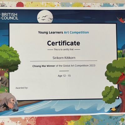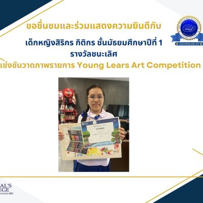 ขอชื่นชมและร่วมแสดงความยินดีกับ เด็กหญิงสิริกร กิติกร นักเรียนชั้นมัธยมศึกษาปีที่  1 ที่ได้รับรางวัลชนะเลิศ จากการแข่งขันวาดภาพรายการ ประกวด Young Lears Art Competition ระดับอายุ 12-15 ปี จัดโดย British council วันที่ 1 กรกฎาคม – 13 สิงหาคม 2566