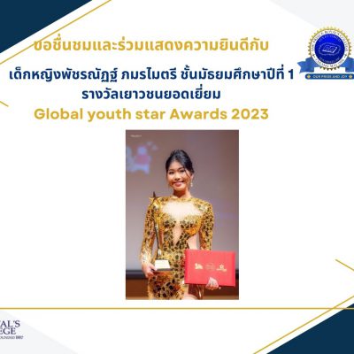 ขอชื่นชมและร่วมแสดงความยินดีกับ เด็กหญิงพัชรณัฏฐ์ ภมรไมตรี นักเรียนชั้นมัธยมศึกษาปีที่ 2 ที่ได้รับรางวัลเยาวชนยอดเยี่ยมสาขาศิลปวัฒนธรรมและดนตรี จากงาน Global youth star Awards 2023 จัดโดยสถานีวิทยุโทรทัศน์กองทัพบก ณ คอมเวนชั่นฮอล์ สถานีวิทยุโทรทัศน์กองทัพบก เมื่อวันที่ 2 กันยายน 2566