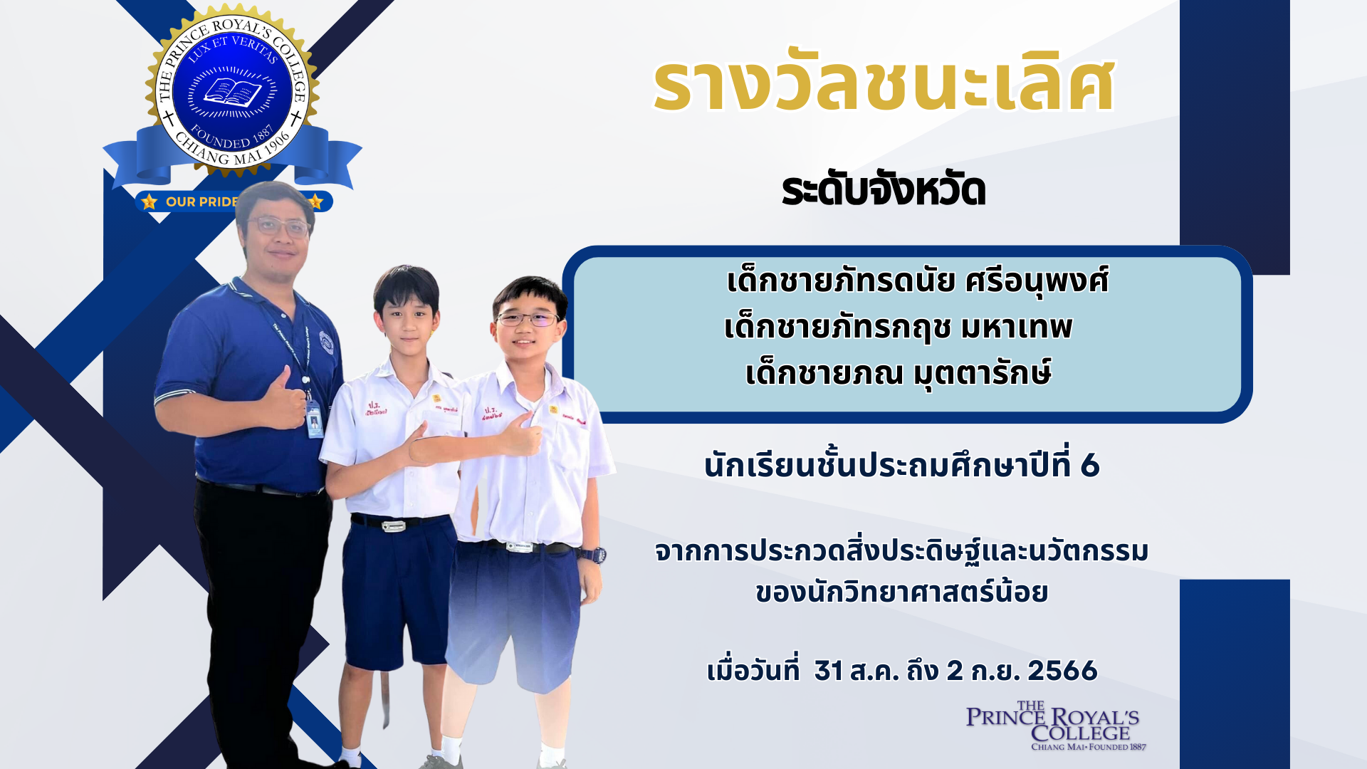 จากการการประกวดสิ่งประดิษฐ์และนวัตกรรมของนักวิทยาศาสตร์น้อย เรื่อง ถังขยะติดเชื้ออัจฉริยะ สัปดาห์วิทยาศาสตร์แห่งชาติ ส่วนภูมิภาค ประจำปี 2566 จัดโดย คณะวิทยาศาสตร์ มหาวิทยาลัยเชียงใหม่  เมื่อวันที่ 31 ส.ค. ถึง 2 ก.ย. 2566