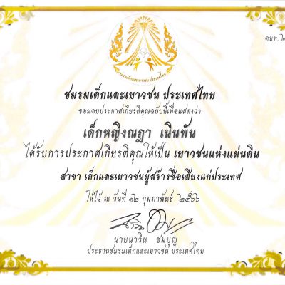 จากงานเยาวชนแห่งแผ่นดิน สาขา เด็กและเยาวชนผู้สร้างชื่อเสียงแก่ประเทศ จัดโดย ชมรมเด็กและเยาวชน ประเทศไทย เมื่อวันที่ 3 กรกฎาคม 2566