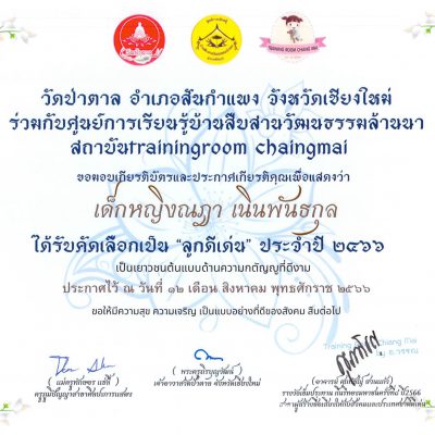 จากงานพิธีมอบเกียรติบัตรลูกที่มีความกตัญญูกตเวทีอย่างสูงต่อแม่ ประจำปี 2566 จัดโดย วัดป่าตาล อำเภอสันกำแพง จังหวัดเชียงใหม่่วมกับศูนย์การเรียนรู้บ้านสืบสานวัฒนธรรมล้านนา สถาบัน Training Room Chiangmai เมื่อวันที่ 12 สิงหาคม 2566
