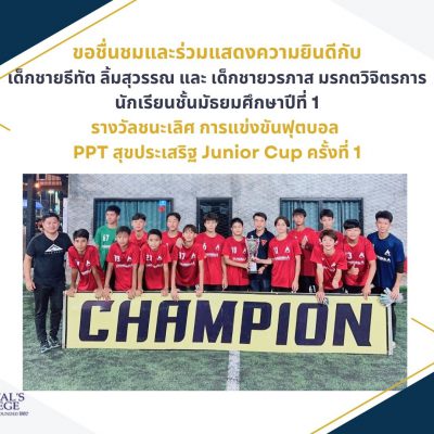 ขอชื่นชมและร่วมแสดงความยินดีกับ เด็กชายธีทัต ลิ้มสุวรรณ และ เด็กชายวรภาส มรกตวิจิตรการ นักเรียนชั้นมัธยมศึกษาปีที่ 1 ที่ได้รับรางวัลชนะเลิศอันดับที่ 1 จากการแข่งขันฟุตบอลรายการ “ PPT สุขประเสริฐ JUNIOR CUP ครั้งที่ 1 ” รุ่นอายุไม่เกิน 13 ปี ณ สนามฟุตบอล PPT สุขประเสริฐ จ.ลำพูน เมื่อวันที่ 27 สิงหาคม 2566