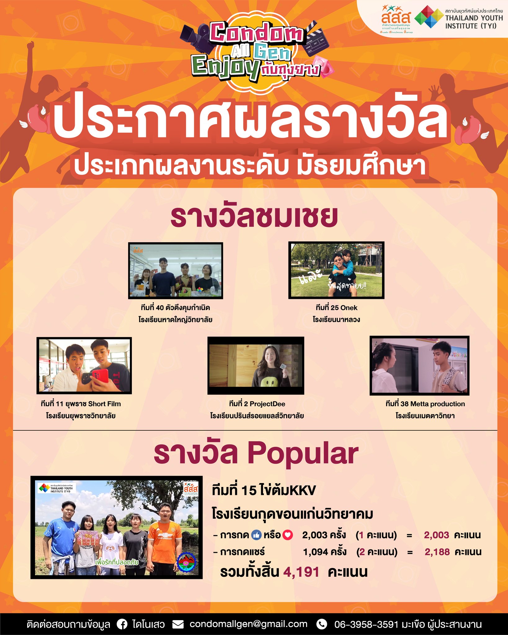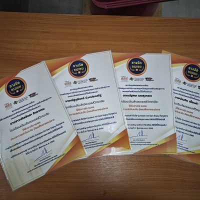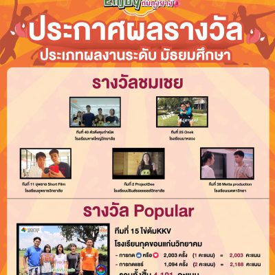 ขอชื่นชมและแสดงความยินดีกับนักเรียนที่ได้รับรางวัลชมเชย ประเภทผลงานระดับมัธยมศึกษา  จากโครงการประกวดโฆษณารณรงค์ หัวข้อ “Condom All Gen Enjoy กับถุงยาง”  ประกาศผลเมื่อวันที่ 21 สิงหาคม 2566     แข่งขันรูปแบบออนไลน์  จัดโดย สำนักงานกองทุนสนับสนุนการสร้างเสริมสุขภาพ (สสส.) และ สถาบันยุวทัศน์แห่งประเทศไทย (TYI)  (ระดับประเทศ)