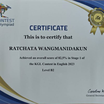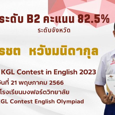 ขอชื่นชมและแสดงความยินดีกับ นายรชต หวังมนิดากุล ม.5/9 ที่ได้คะแนน 82.5% ระดับ B2 การแข่งขัน KGL Contest in English 2023 วันที่ 21 พฤษภาคม 2566 ณ โรงเรียนมงฟอร์ตวิทยาลัย จัดโดย KGL Contest English Olympiad