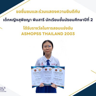 รายการแข่งขัน ASMOPSS THAILAND 2023 การแข่งขันทางวิชาการ ระดับประเทศ ประจำปี พ.ศ. 2566จัดโดย Asian Science & Mathematics Olympiad for Primary and Secondary Schools สอบวันที่ 19 สิงหาคม 2566 ณ โรงเรียนอนุบาลเชียงใหม่