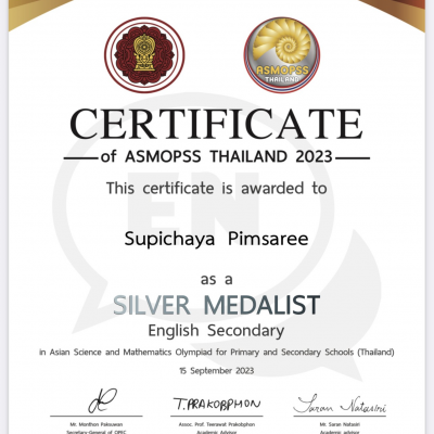 2. รางวัลเหรียญเงินในการสอบแข่งขันวิชาภาษาอังกฤษระดับชั้นมัธยมศึกษาตอนต้น : Silver Medalist English Secondary